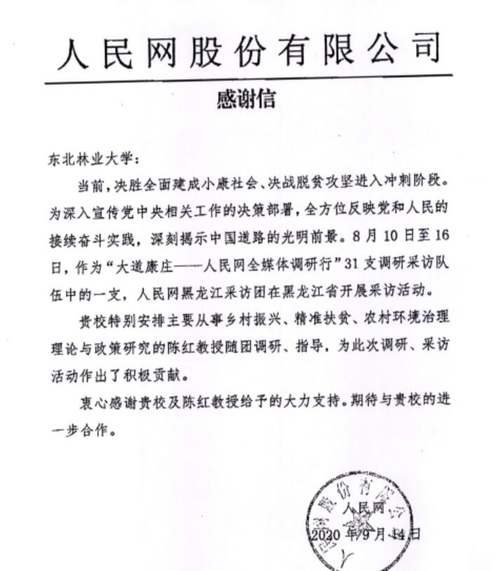 人民网采访团领队刘军涛表示,陈红教授前后去了十几个采访点,不辞劳苦、积极指导,为人民网在黑龙江的采访活动出谋划策,充分展现了东林人的敬业、专业。人民网为此特向学校发来感谢信。